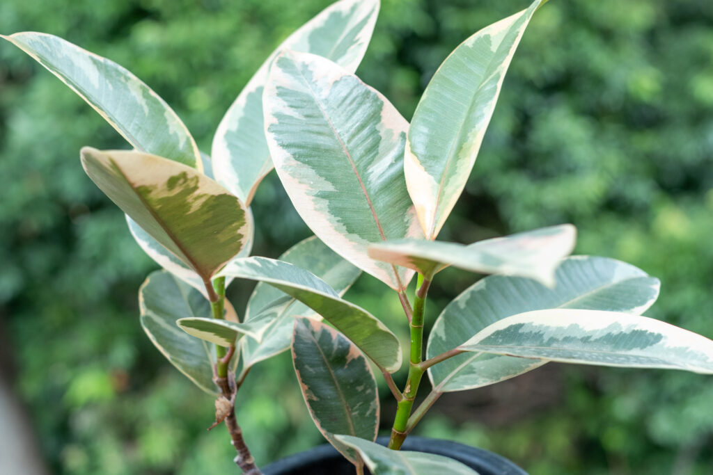 フィカス ルビーは、緑・ピンク・クリーム・赤みを帯びる色などを混ぜたマルチカラーの斑入り品種です。