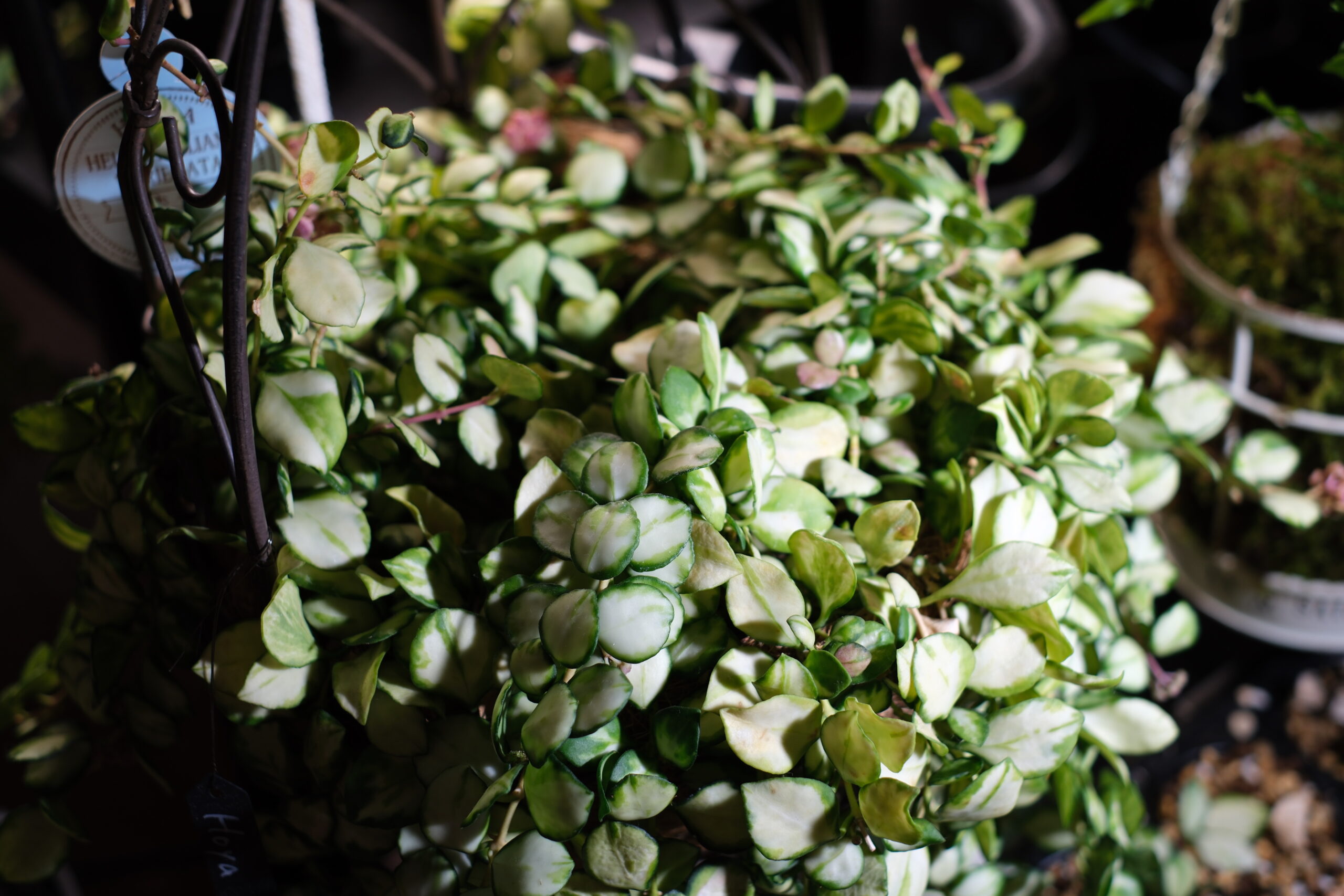 ホヤの中では小型で肉厚の葉をしているヘウスケリアナの斑入り品種。斑の色は淡い黄緑~クリーム色の覆輪斑や中斑 が入り、やわらかい印象。